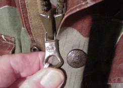 6180F - Large - XL ( chest = 50”, 35”+, back = 28.5” ), dated 1957, Camouflage FIELD JACKET, with "RI-RI" OG Plastic Zipper, pebble-pattern snaps, Data Label reads: “OBERRH KLE DERWERKE APPENW../BADEN 8400/12/120 2275 177 100 45 63 JAN. 1957”, missing 4 x Buttons, all Glove-Snaps function, minor light-green paint stains, no hood, not sure of pattern but has “falling rain lines” in it, Excellent Color, Used....(sold)