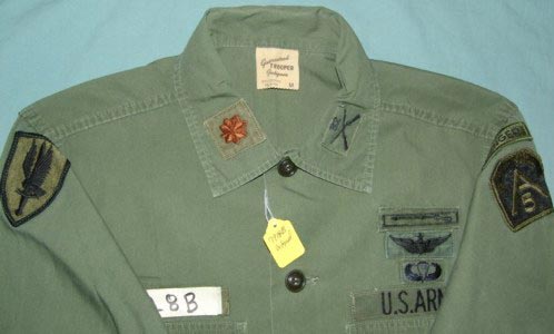 37xx - 46 Long, dated 1972, ME Patches: “Special Forces” Arc, “Airborne” Arc, & Special Forces SSI on Left Sleeve; “Airborne” Tab and Special Forces SSI on Right Sleeve. 9 x Combat Bars (4 ½ years of Combat Zone Duty) on lower right, (Had 4-5 rows of Ribbons and some Badges on left Breast & a few awards and Jump Wings on right breast)sleeve, inside label needs re-sewn, no markings except for laundry tag, Used.........(sold)